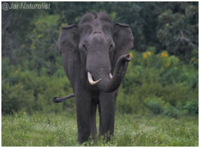 The highlight of the safari was the sighting of wild matriarchal Elephant families with young calves trotting along, a herd of Gaur (Indian Bison) with the one ton male in the lead, and the Amazing paradise flycatcher bird to name a few. The second day started at the camp started very early with Yoga and Exercise by my friend Loknath, followed by a birding trail around the campus. To our surprise we saw a big handsome tusker roaming and grazing in front of us, Children were amazed at this gentle giant, before they could look further some of them spotted wild dogs disturbing another Tusker a bit far away.